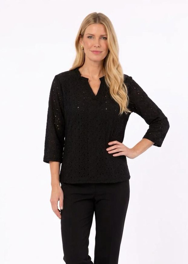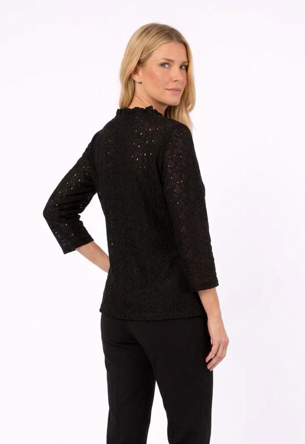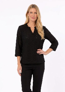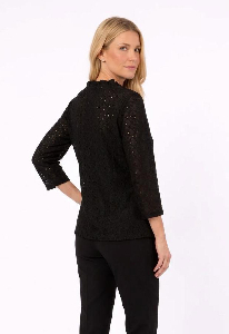 Remera Bethania , delicada y femenina. Cuello con volado y escote en V con media cartera que aportan un toque romántico, combinado con manga 3/4 para un look cómodo. Confeccionada en broderie liso, ideal para outfits suaves y con estilo.