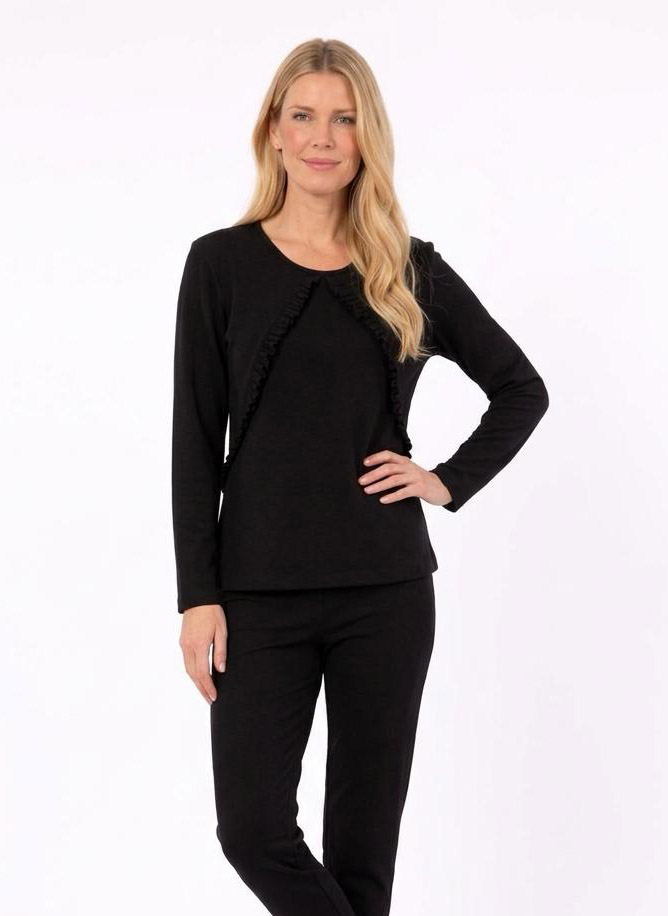 Remera Betiana , femenina y con detalle. Escote en U y manga larga, con recortes diagonales y voladitos en el frente que aportan movimiento y delicadeza. Confeccionada en dralon liso, suave y abrigado, ideal para un look cómodo con un toque romántico.