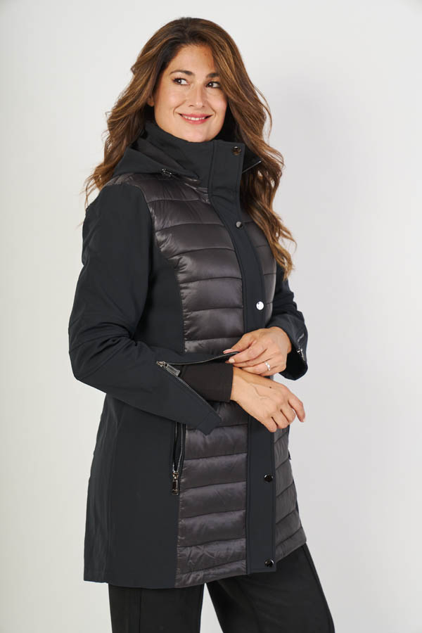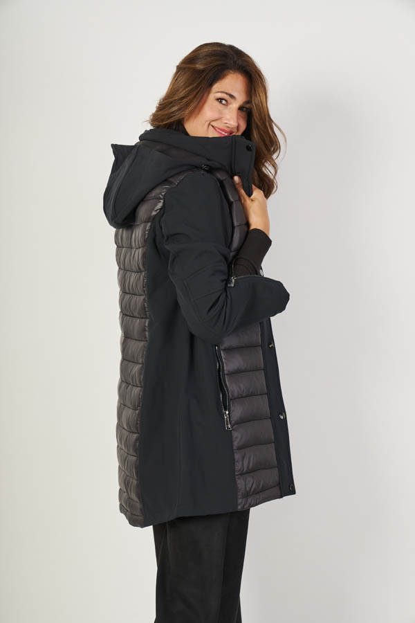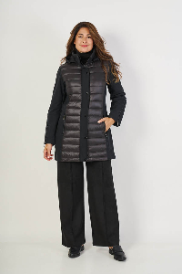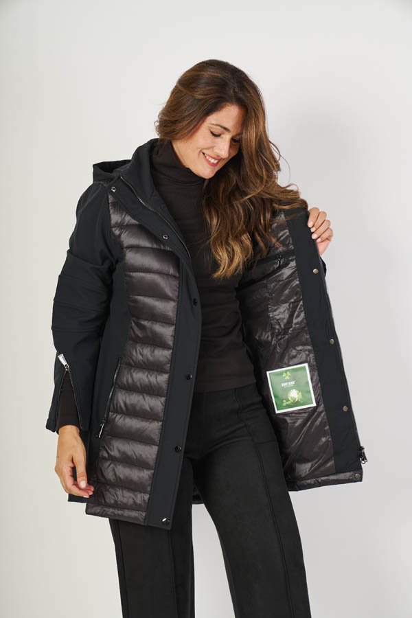 Campera Valentina Larga , funcional y con estilo. Cuello alto con capucha desmontable, frente con relieve canelón y bolsillos prácticos. Confeccionada en microfibra combinada con neoprene lisa, resistente y cómoda, ideal para un look urbano y moderno.